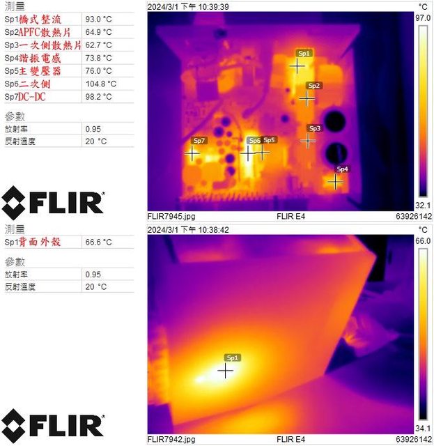 ▼電源供應器滿載輸出下內部(上圖)及背面外殼(下圖)的紅外線熱影像圖(附註:安裝位