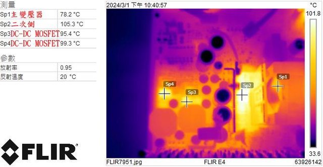 ▼電源供應器滿載輸出下主變壓器/二次側/DC-DC MOSFET的紅外線熱影像圖(附註:安裝