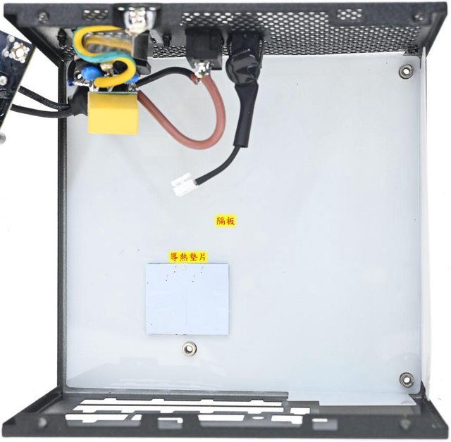 板二次側區域開孔並貼上導熱墊片,協助將熱量傳導至外殼