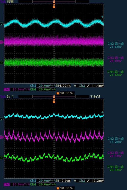 21.6mV/28mV/21.6mV;於純12V全負載輸出下12V/5V/3.3V各路低頻漣波分別為