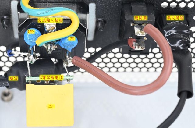 ○磁芯及燈光模式開關有包覆套管,交流輸入插座焊點、總開關焊點及突波吸收器未包覆