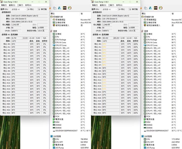 ▼待機(左)及高負載(右)的CORE TEMP及AIDA64感測器畫面