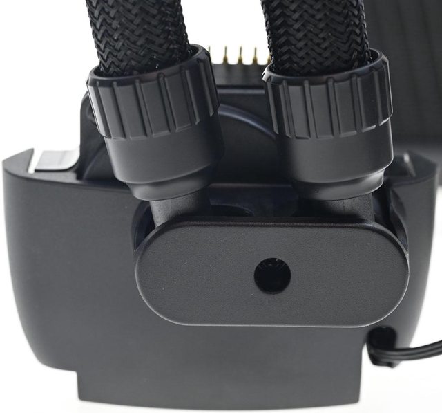 ▼水冷排進/出水管位於同一側。水管包覆黑色編織網,編織網部分長度41.5公分,兩端