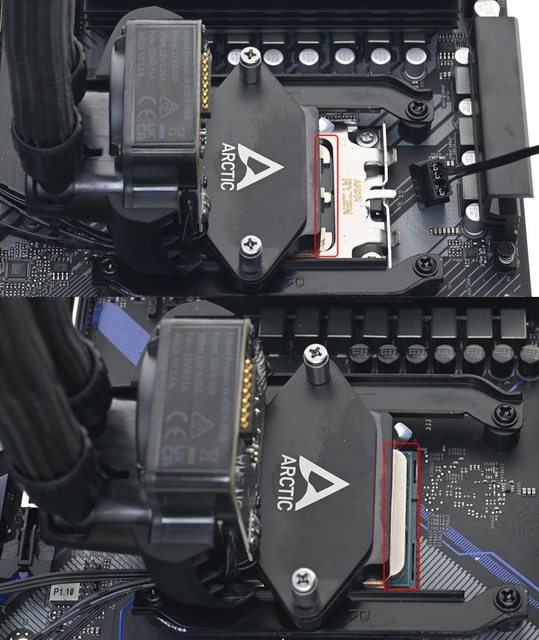 ▼因為AMD AM5/AM4偏移托架的緣故,整個水冷頭會往擴充槽方向偏移,水冷頭管路位置