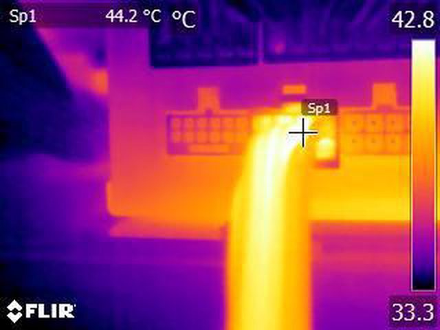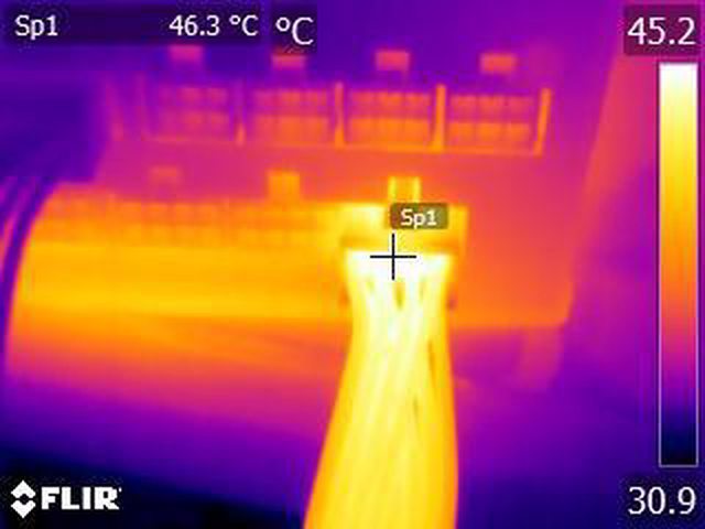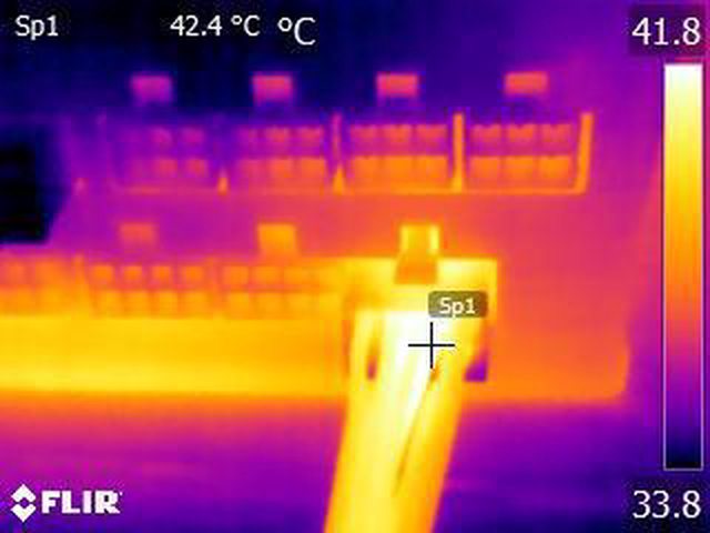 ▼單條PCIE 6+2P(雙頭)連續輸出21A(252W)10分鐘後的電源端模組化接頭紅外線熱影像圖