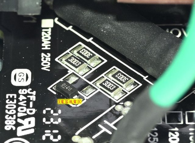 ▼主電路板上臥式安裝的保險絲旁有X電容放電IC及電阻