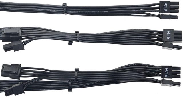 ▼3條顯示卡電源黑色帶狀模組化線路,提供5個PCIE 6+2P接頭,1條單接頭16/18AWG線路