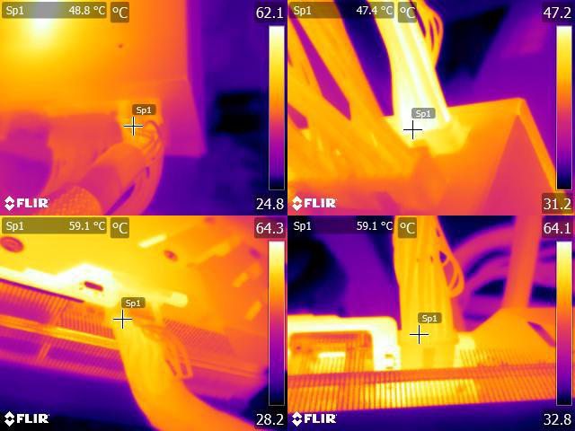 ▼執行FURMARK 30分鐘後電源端插頭(左上/右上)及顯示卡端插頭(左下/右下)的紅外線熱