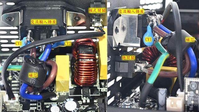 ▼交流輸入插座焊點加上2個Y電容(CY1/CY2)。磁芯有包覆套管,交流輸入插座、總開關
