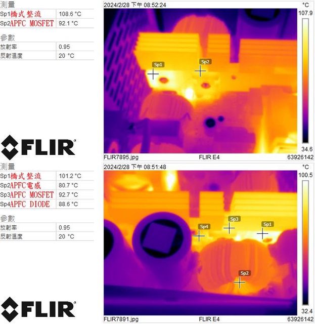 ▼電源供應器滿載輸出下橋式整流/APFC MOSFET(上圖)及橋式整流/APFC電感/APFC