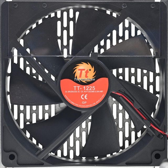 ▼直接在外殼上沖壓長條形橢圓開孔風扇護網,中間有thermaltake商標銘牌