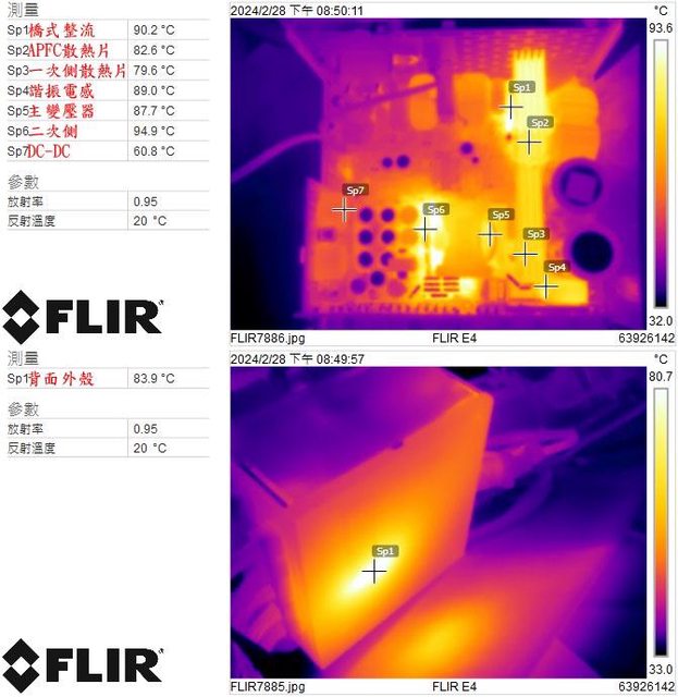 ▼電源供應器滿載輸出下內部(上圖)及背面外殼(下圖)的紅外線熱影像圖(附註:安裝位