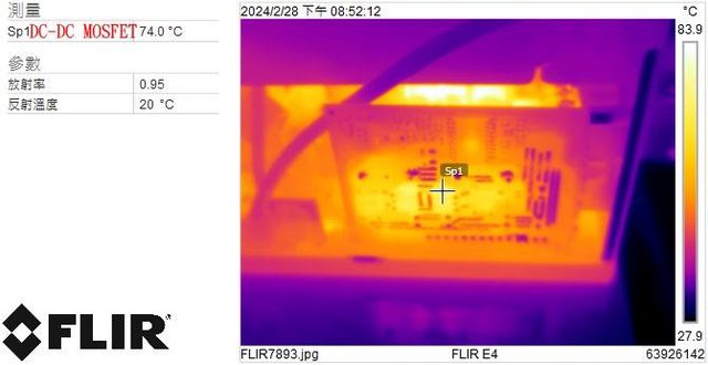 ▼電源供應器滿載輸出下DC-DC MOSFET的紅外線熱影像圖(附註:安裝位置環境溫度會影