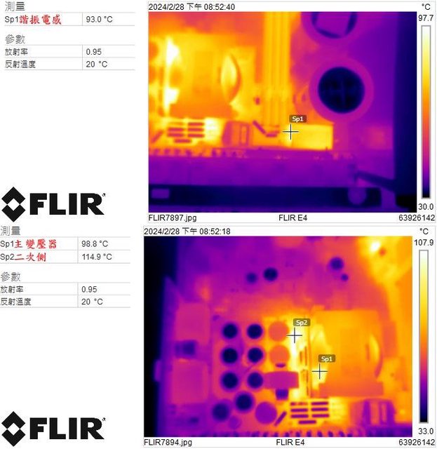▼電源供應器滿載輸出下諧振電感(上圖)及主變壓器/二次側(下圖)的紅外線熱影像圖(附