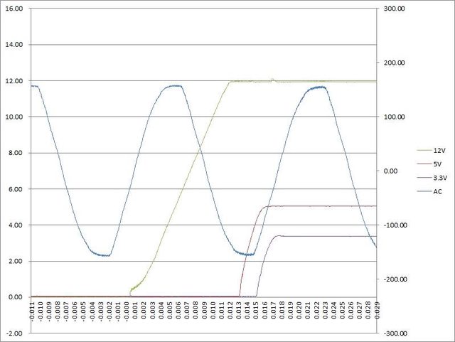 ○電源啟動至綜合全負載輸出狀態,12V上升時間12ms,5V上升時間3ms,3.3V上升時間