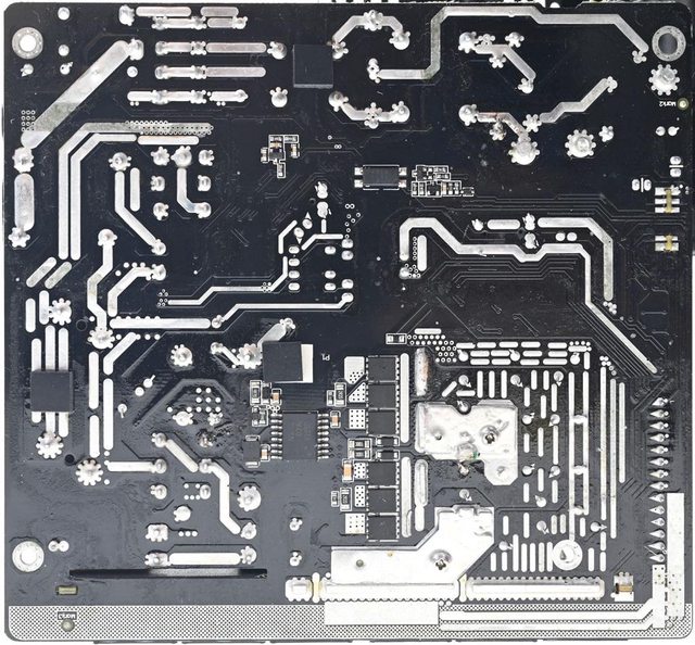 ▼主電路板背面焊點做工良好,大電流線路有敷錫,於部分二次側區域加裝金屬板