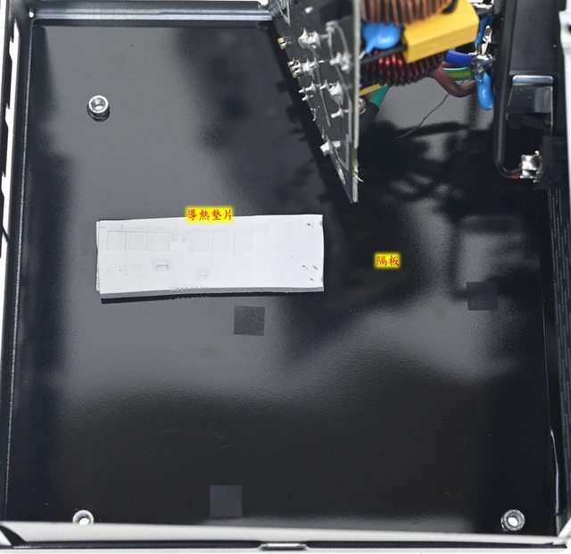 ▼外殼底部黑色隔板於主電路板二次側區域開孔並貼上導熱墊片