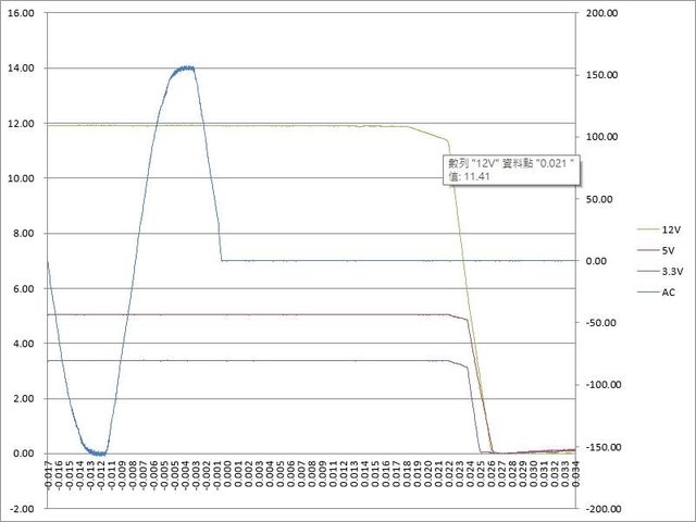○綜合全負載輸出狀態切斷AC輸入模擬電力中斷,12V於18ms開始壓降,於21ms降至