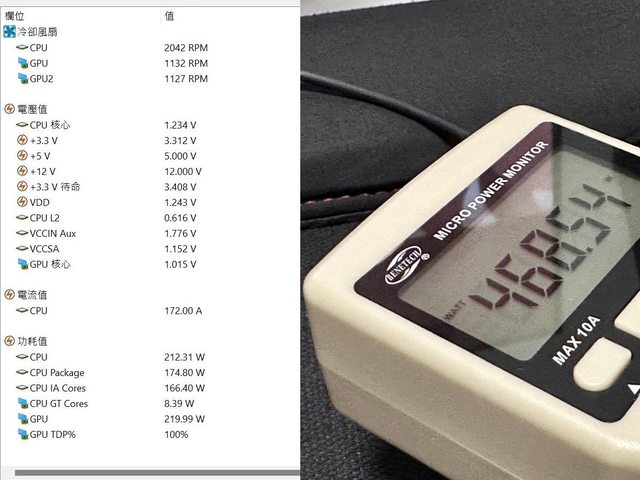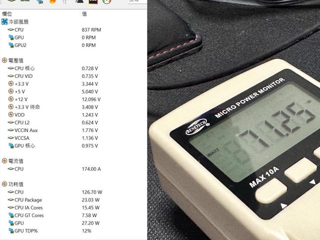 雙烤時瓦數消耗為468.5%,約佔GX III 1050的45%,則依軟體標示的功耗值轉換率應該也