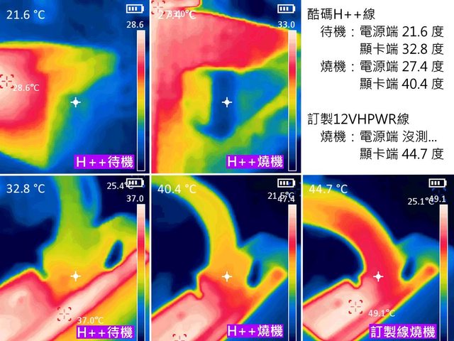 雖然個人沒有訂製線在燒機時電源端的溫度照片,但個人測試時訂製線與H++線電源端溫
