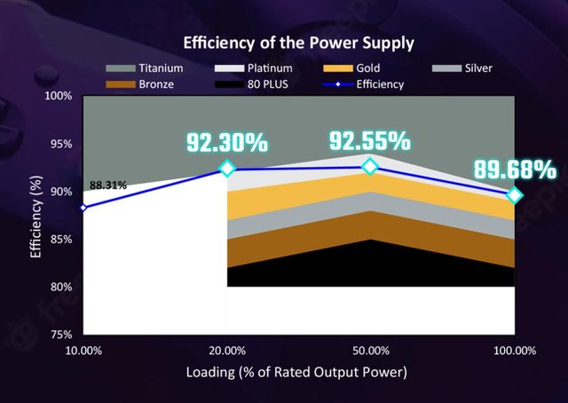 依官網資訊在20%負載下時1050W的轉換率為92.30%(750W為92.17%、850W為92.9%、1250W