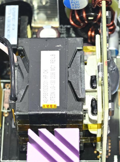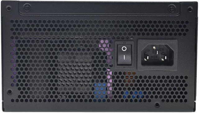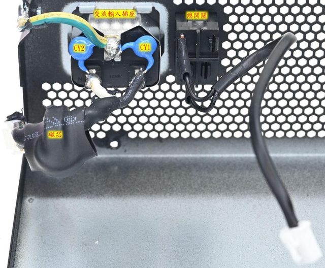 ▼本體出風口處設有電源總開關及交流輸入插座,透過網孔可看到內部紫色散熱片