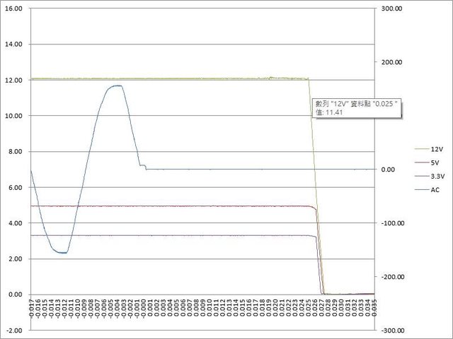 ○綜合全負載輸出狀態切斷AC輸入模擬電力中斷,12V於25ms降至11.41V