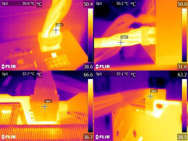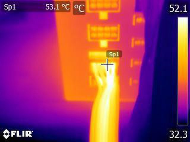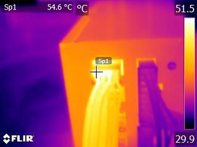 ▼單條PCIE 6+2P連續輸出21A(252W)10分鐘後的電源端模組化接頭紅外線熱影像圖(附註