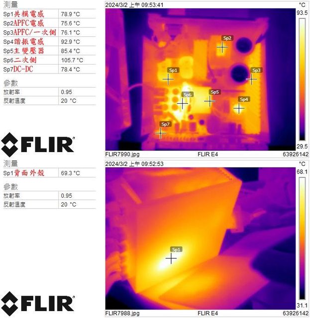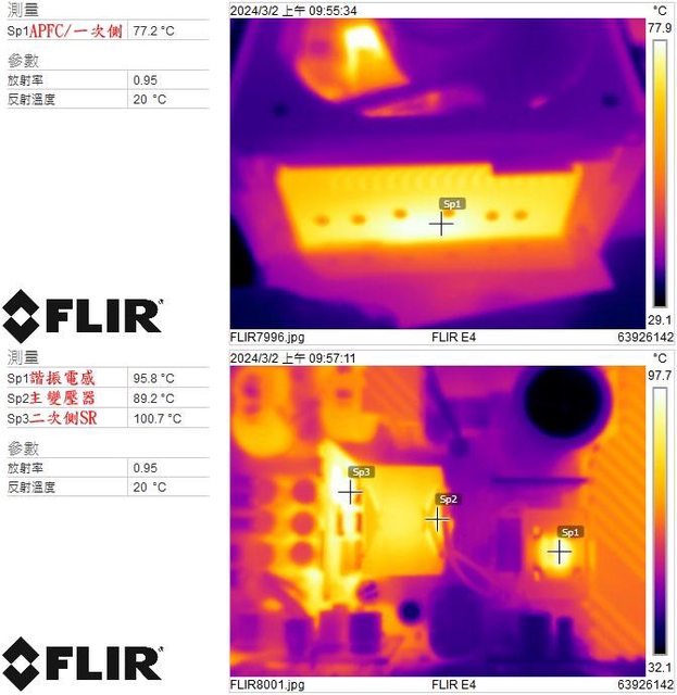 ▼電源供應器滿載輸出下APFC/一次側散熱片(上圖)及諧振電感/主變壓器/二次側SR(下圖