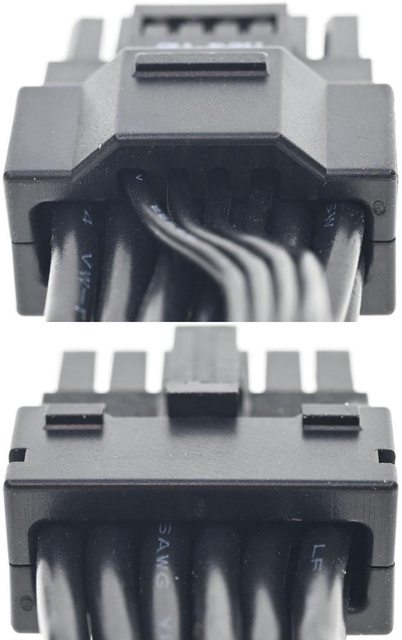 ○12VHPWR模組化線材的電源端接頭具備防退pin保護框,顯示卡端接頭採用直角接頭