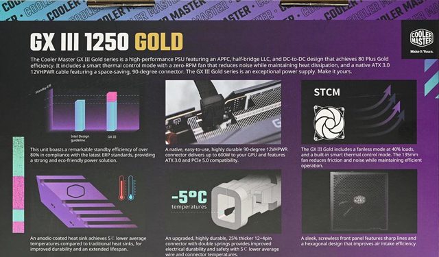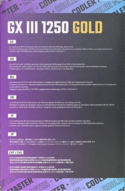 ▼外盒背面有GX III 1250 GOLD名稱、Cooler Master商標/標語、特色圖片/英文說明
