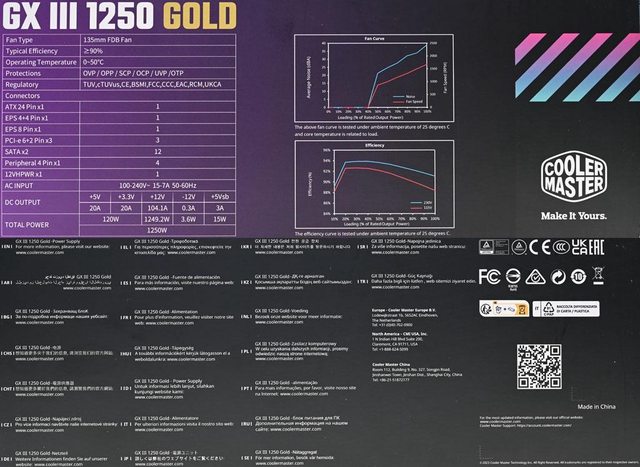 出百分比圖表、轉換效率圖表、Cooler Master商標/標語。外盒下側面有"GX III 1250