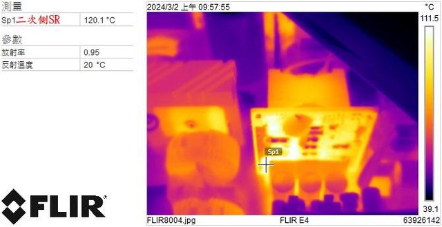 ▼電源供應器滿載輸出下二次側SR的紅外線熱影像圖(附註:安裝位置環境溫度會影響測