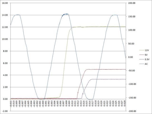 ○電源啟動至綜合全負載輸出狀態,12V上升時間12ms,5V上升時間4ms,3.3V上升時間