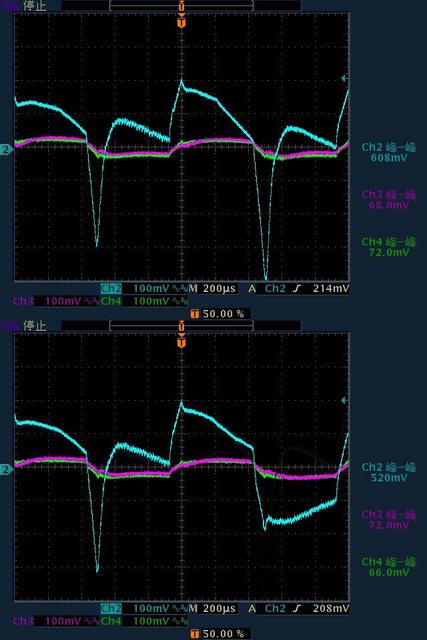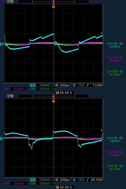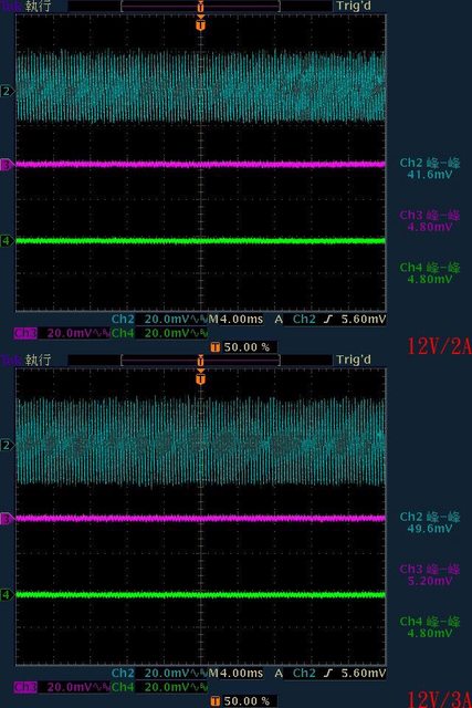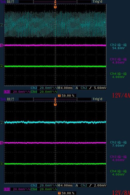 ▼輸出12/4A時有最大12V漣波(上圖),輸出12V/8A時有最小12V漣波(下圖)