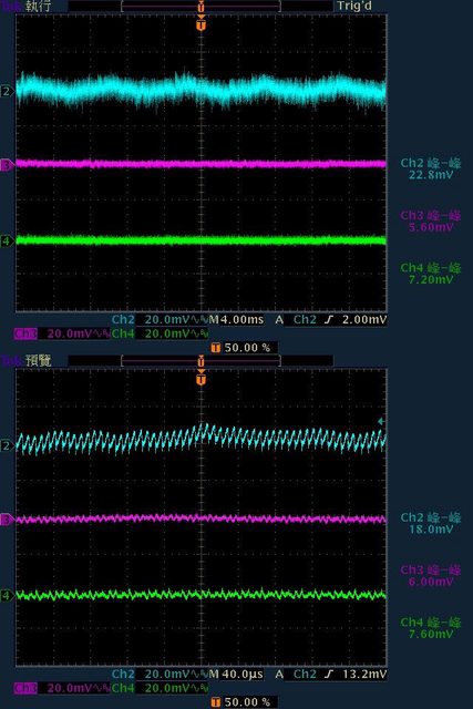 22.8mV/5.6mV/7.2mV,高頻漣波分別為18mV/6mV/7.6mV