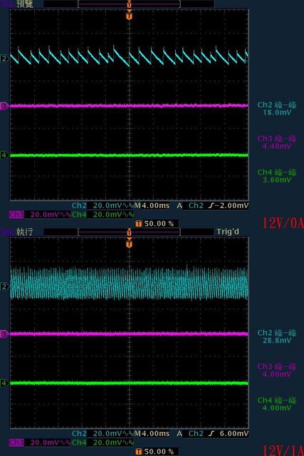 ▼輸出無負載時12V有鋸齒狀漣波(上圖),輸出12V/1A時12V鋸齒狀漣波頻率提高(下圖)