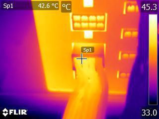 ▼單條EPS 8P連續輸出28A(336W)10分鐘後的電源端模組化接頭紅外線熱影像圖(附註:安