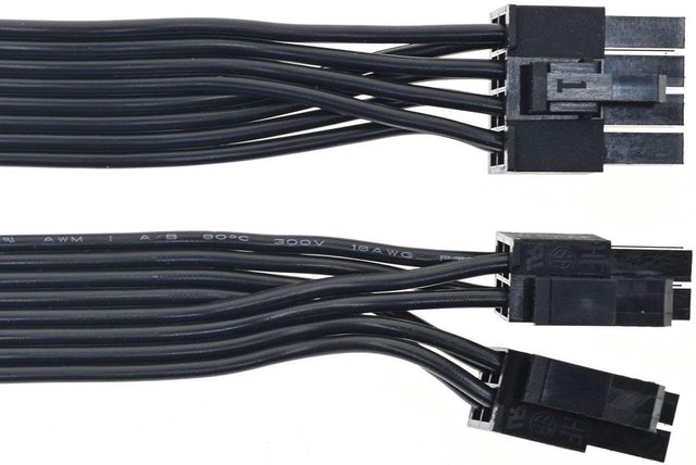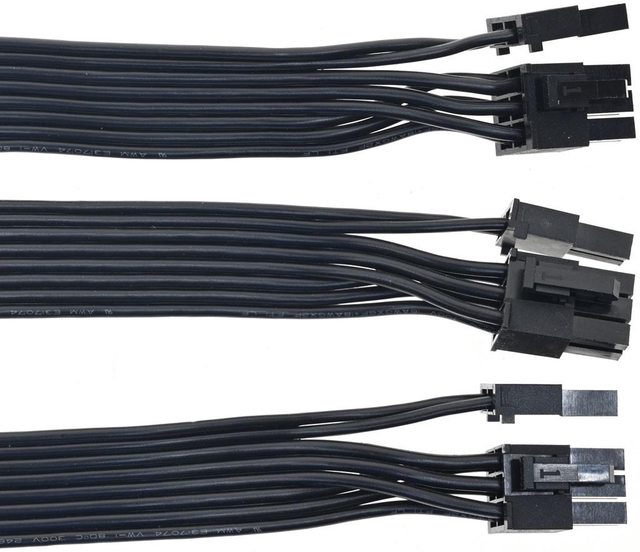 ▼3條顯示卡電源黑色帶狀模組化線路,提供3個PCIE 6+2P接頭,16AWG×6+18AWG×2線路