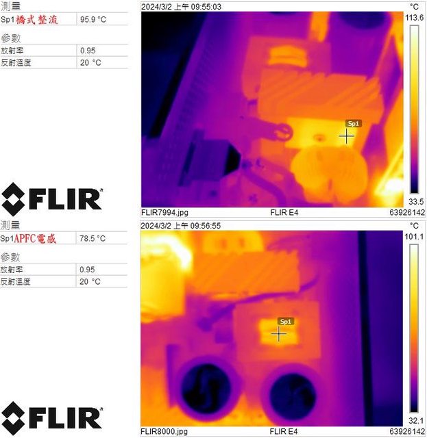 ▼電源供應器滿載輸出下橋式整流(上圖)及APFC電感(下圖)的紅外線熱影像圖(附註:安