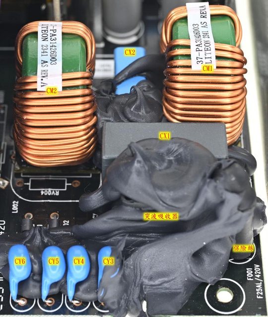 覆套管,保險絲/突波吸收器被大量固定膠覆蓋,交流輸入插座焊點沒有包覆套管