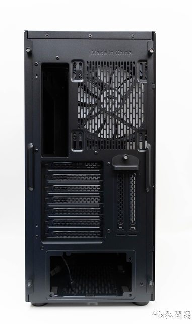 背面可看到除了固有的7槽PCI位之外也有特別作直立位的開口