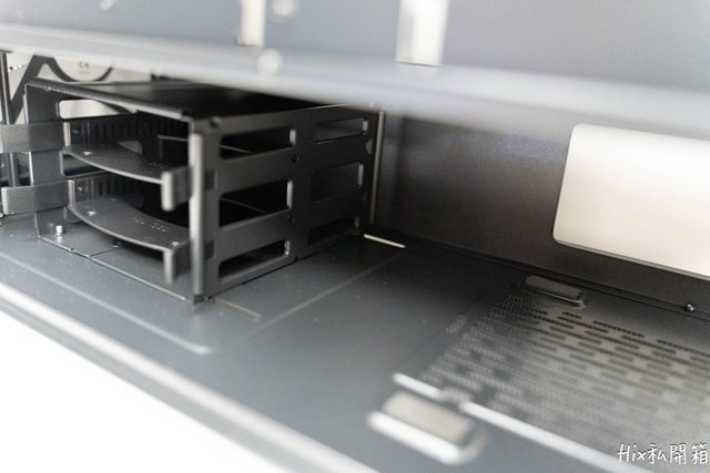 電供位的防塵網非磁吸式的,而也可以看到3.5吋硬碟籠在這有作滑軌設計