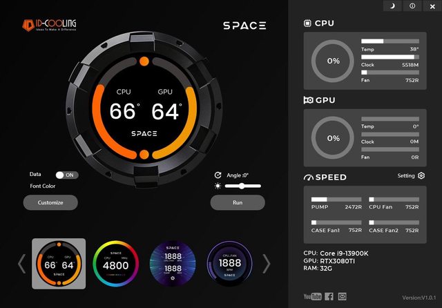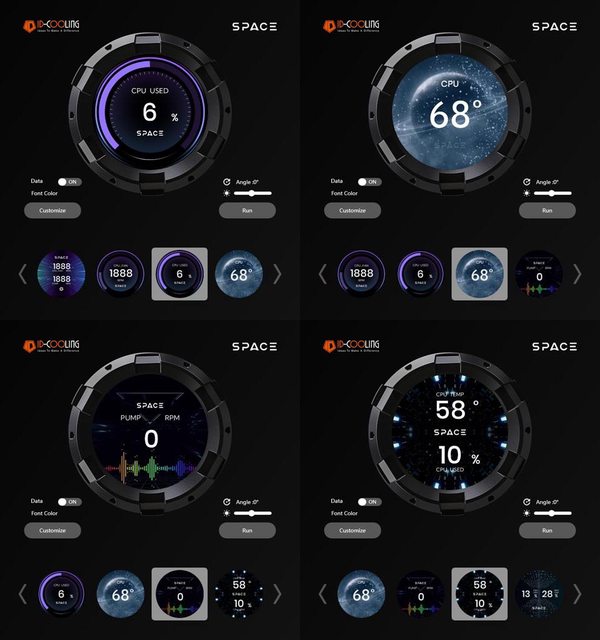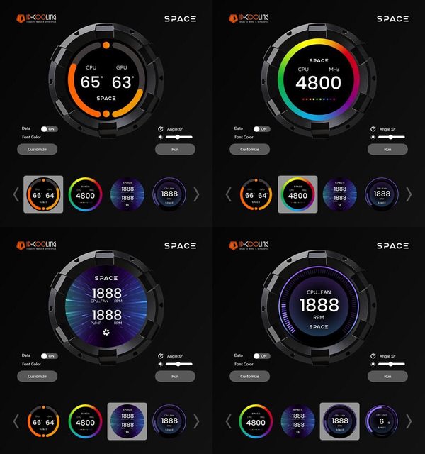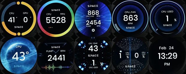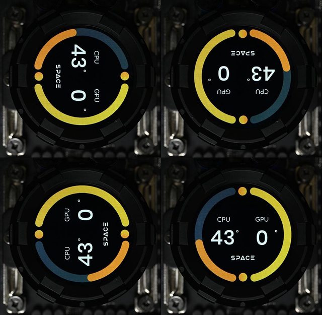 幕,專用SPACE軟體可顯示即時CPU/GPU溫度、風扇轉速、頻率、使用率等監控資訊及時間