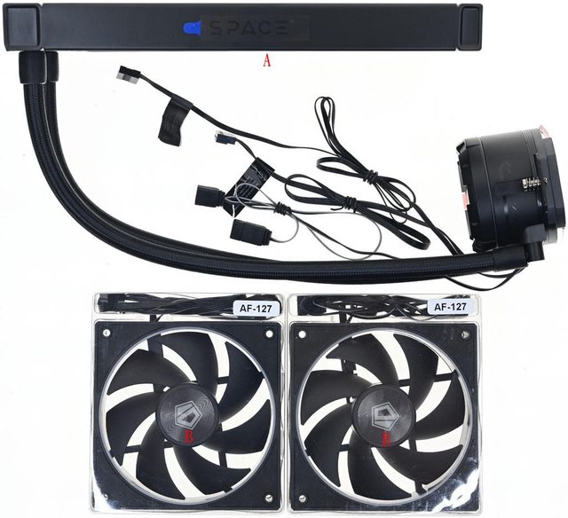 ▼包裝內容有SL240一體式水冷本體(A)及裝在透明盒內的AF-127-ARGB-K發光風扇(B)