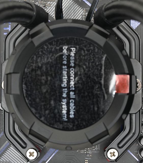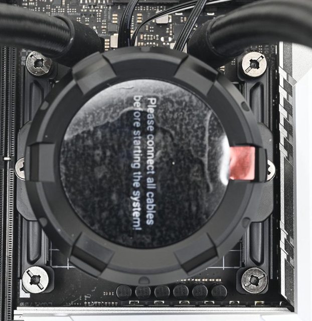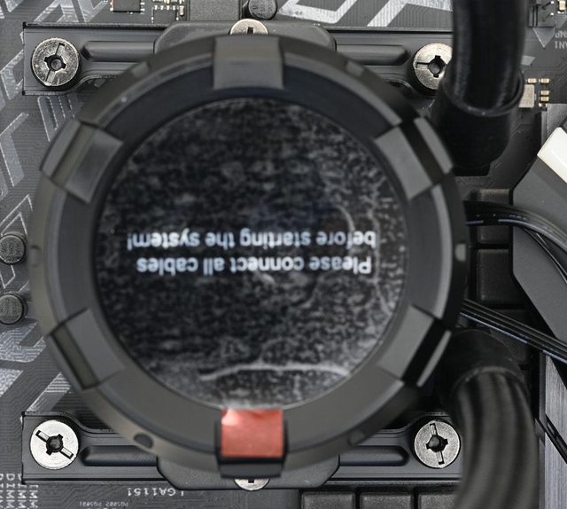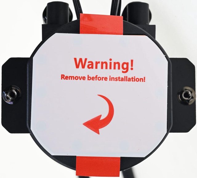 ▼水冷頭處理器接觸面有一張保護貼,上面印上"警告!安裝前移除"英文