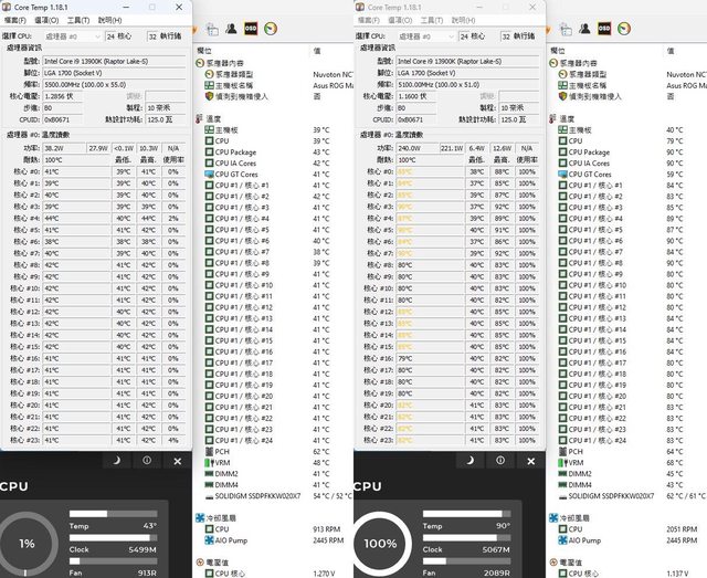 ▼功耗限制240W下待機(左)及高負載(右)的CORE TEMP及AIDA64感測器畫面