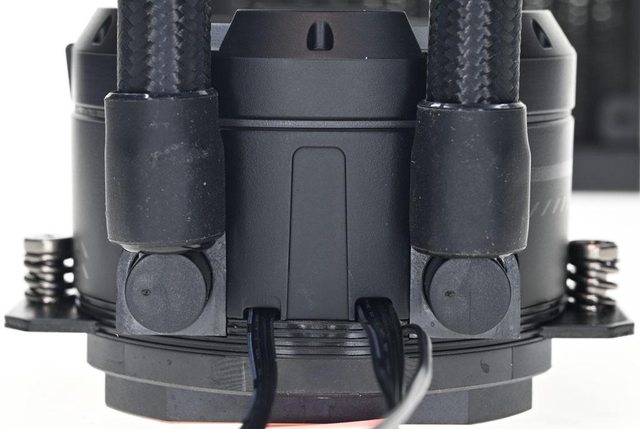 ▼水冷頭進/出水管直角接頭可小幅度左右旋轉,接頭之間區域下方接出幫浦4pin PWM線