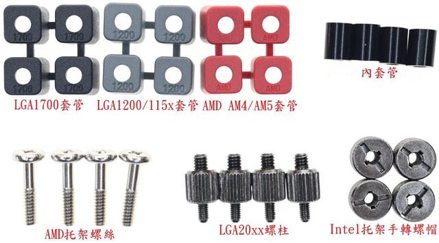 ▼配件有Intel LGA1200/115x背板(C)、Intel LGA1700背板(D)、內含托架固定配件的透