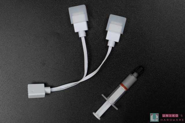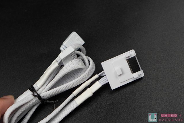 側邊線材為 4pin 風扇和 5V ARGB 針腳各一,兩者可各自藉由額外提供的 ARGB 線材和 Fa